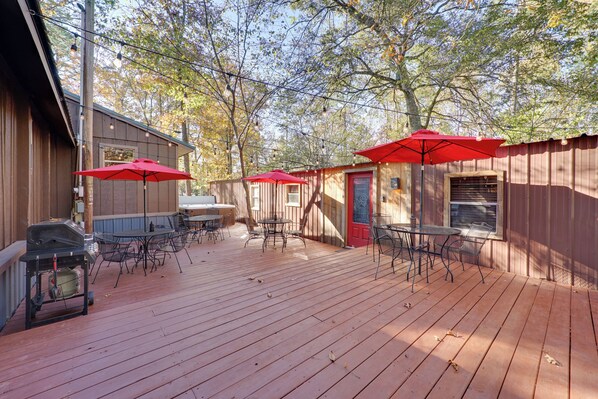 Relaxing Hochatown Cabin w/ Deck & Hot Tub! provides amenities, such as a firepit and a garden. Guests can connect to free WiFi in public areas.