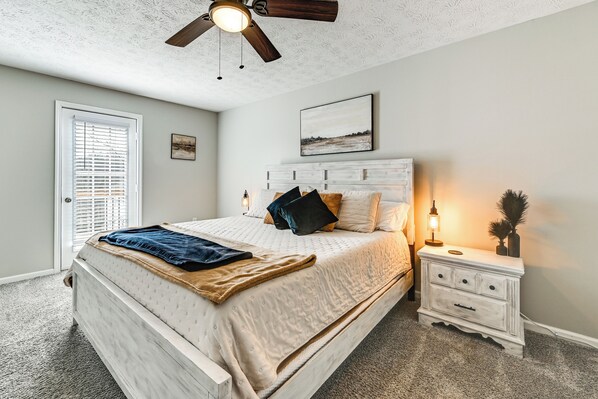 All guest rooms at Lake Days & Fireside Nights! Updated Burnside Home include comforts, such as laptop-friendly workspaces and air conditioning.