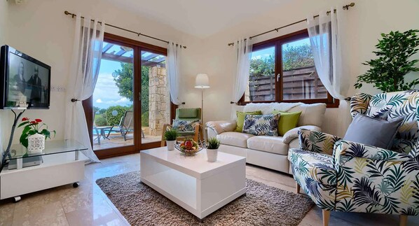 Villa, 2 Bedrooms | Living area | Flat-screen TV, DVD player - Lovely 2 bedroom Villa Kornos HG33 with private pool and golf course views, In the heart of Aphrodite Hills, near resort centre (Kouklia)