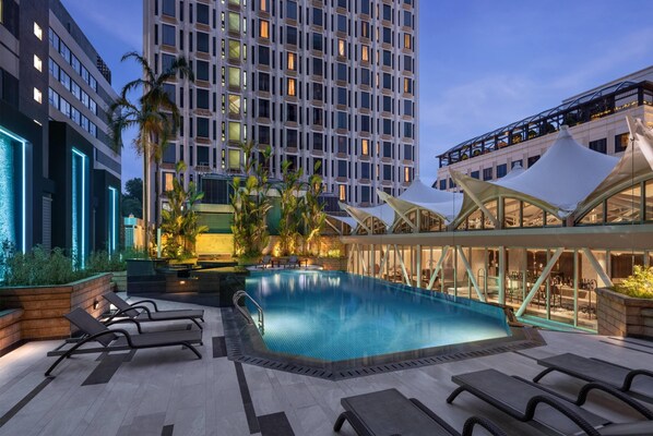 Luxury hotel connected to a shopping centre in Singapore with 2 outdoor swimming pools